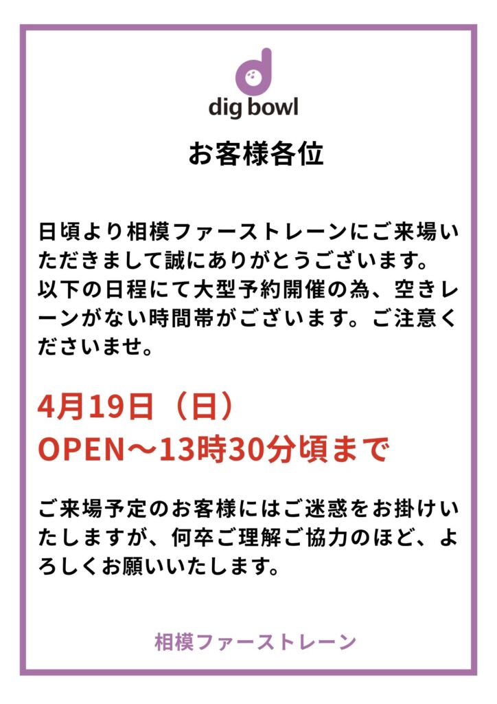 誠に勝手ながら、下記の通り4月19日(日)の下記のお時間は大型予約開催の為空きレーンがない時間帯がございます。